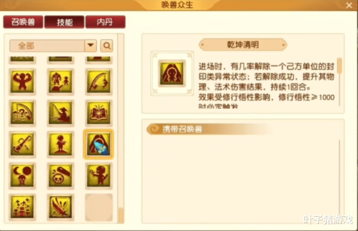乾坤晴明:有几率铲除己方一个单元的封印特殊状况。当孩子修行悟性达到1000时,该服从必定触发。在解封药紧缺时,召唤此孩子可解燃眉之急。